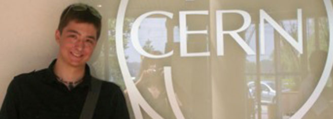 student next to CERN sign